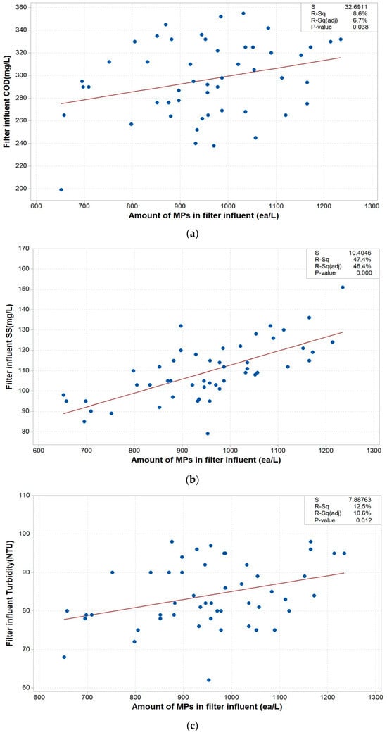 Correlation between microplastics and water pollutants: (a) COD vs. MPs; (b) SS vs. MPs; (c) turbidity vs. MPs.