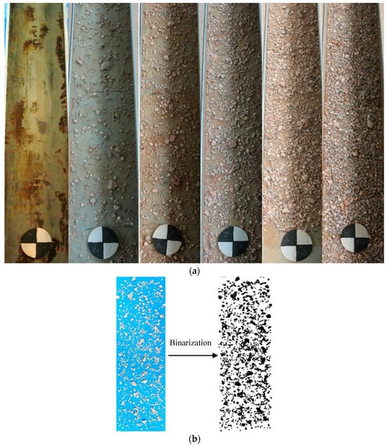 Field investigations revealed that a typical gravel-covered slope can reach a maximum gradient of ~40°. Therefore, the slope was designed with four gradients: 10°, 20°, 30°, and 40°. The flow discharge was converted from field rainfall and slope catchment area. The rainfall data analysis for the Yangkeng watershed revealed that the highest 30 min rainfall intensity (I30) over the past 20 years reached 2.5 mm min−1. Field investigations revealed that the upper slope of a fine ditch in the area could have a catchment area of 4 m² (calculated as 8 m × 0.5 m). With a slope runoff coefficient of 0.8, the corresponding upper inlet flow discharge is 8 L min−1. Additionally, on a 10° slope, a flow discharge of 2 L min−1 is sufficient to achieve the uniform transport of most soil particles by water flow in a 12 cm wide fine-groove flume. Therefore, four flow discharge values were selected for the study: 2, 4, 6, and 8 L min−1. The corresponding unit flow discharge values were 0.28 × 10−3, 0.56 × 10−3, 0.83 × 10−3, and 1.11 × 10−3 m2 s−1. According to the field survey, the gravel cover in the study area reached 93.2%. To simulate the natural conditions of gravel-covered slopes, this study established five gravel cover gradients, i.e., 20%, 35%, 50%, 75%, and 90%, with 0% cover as a control group, resulting in a total of six cover conditions (Figure 2a). A layer of universal adhesive glue of appropriate thickness was evenly applied to the flatbed surface, with the amount of glue adjusted based on the size of the gravel particles. Gravel was then randomly and evenly distributed on the flume bed surface without overlap of the particles. The mass of gravel required for each coverage level was determined based on the established relationship between gravel coverage and mass. First, a specific mass of mixed gravel was uniformly spread without overlapping on 0.12 m × 0.4 m colored cardboard, ensuring high contrast between the gravel and the background. This setup was then photographed vertically by using a fully automatic optical camera with a fixed 28 mm focal length, positioned 50 cm from the cardboard. The original image was processed by using Image J (1.54f; win64) software to create a binary image containing two pixel values: 0 and 255 (representing black and white, respectively) (Figure 2b). The ratio of black pixels to the total number of pixels was calculated by using MATLAB (R2021b) to determine the coverage degree. A linear equation was established between the degree of gravel coverage and the quality of gravel. Therefore, the quality of gravel required for different coverage levels (20%, 35%, 50%, 75%, and 90%) was calculated. The relationship between gravel coverage and mass was expressed as Y = 0.59X + 2.29. The accuracy of the linear equation was assessed by using the coefficient of determination R2 [36] and Nash–Sutcliffe efficiency (NSE) [37]. Both metrics yielded values of 0.97, indicating a high degree of accuracy. Therefore, the equation can be used to calculate the gravel mass required for different cover levels based on their relationship.