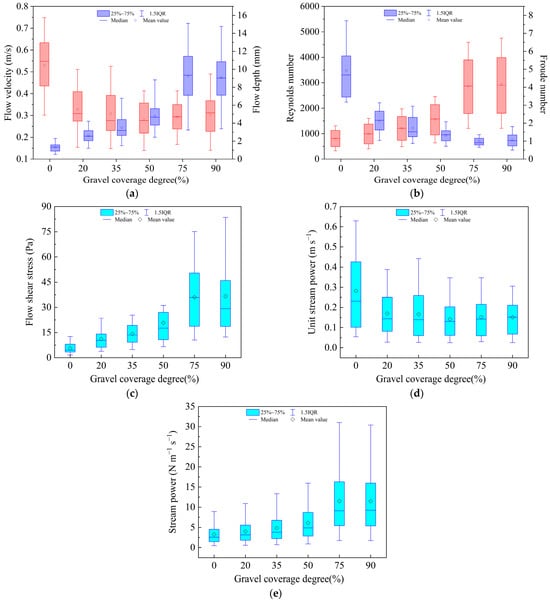 The Reynolds number and Froude number were used to classify the flow regime and surface water flow patterns, and their trends with varying gravel coverage are shown in Figure 3b. As gravel coverage increased, the Reynolds number also increased. At coverage levels below 35%, the flow regime remained mainly laminar. However, as the gravel coverage level exceeded 75%, the water flow shifted to the transitional zone and exhibited turbulent characteristics at higher flow discharge. Unlike the Reynolds number, the Froude number decreased as the gravel coverage increased. When C > 20%, the flow patterns under the same coverage conditions showed a tendency to change from supercritical to subcritical flow under different slope–flow combinations, while when C ≤ 20%, the flow pattern under all slope–flow combinations was supercritical flow (Figure 3b). Both stream power and shear stress increased with the increase in coverage (Figure 3c,d). In contrast, the unit stream power decreased with the increase in cover and followed a trend similar to the flow rate, leveling off at C > 20% (Figure 3e).