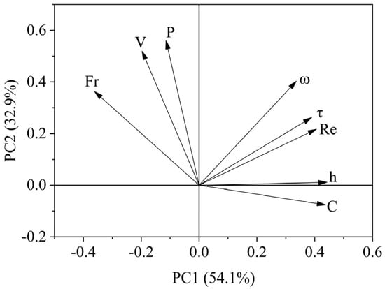 Figure 4 shows the correlation between gravel coverage and hydrodynamic parameters, with the direction and length of the arrows indicating the extent and nature of their influence. Gravel coverage exhibited a positive correlation with water depth, the Reynolds number, shear stress, and stream power but featured a negative correlation with flow velocity, the Froude number, and unit stream power. Additionally, the degree of gravel coverage had a greater impact on flow depth than on flow velocity. The influence of gravel coverage on parameters related to the flow regime and flow pattern was similar. Gravel coverage had a stronger effect on shear stress than on stream power. Because the angle between gravel coverage and unit stream power was the closest to 90°, unit stream power was the least influenced by gravel coverage.