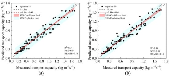 The analysis results revealed that both Equations (18) and (19) effectively simulated the Tc values (with R2 values starting from 0.94, an NSE of 0.94, and RRMSE of 0.14). The data points for the Tc values simulated by these equations and the actual measured values were uniformly distributed around a 1:1 straight line (Figure 6). This indicates that the Tc values predicted by both equations closely matched the measured values. Therefore, both equations are suitable for predicting Tc values under gravel-covered slopes.