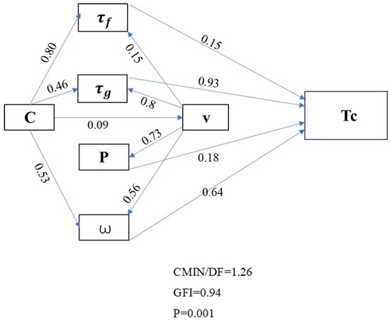 The Pearson correlation analysis (Table 3) reveals that Tc is positively correlated with flow velocity, stream power, shear stress, and unit stream power. However, water depth has a minimal effect on Tc. Under gravel cover conditions, the effects of water depth and unit stream power on Tc remain relatively stable, while the influence of shear stress and stream power on Tc significantly decreases. Among all parameters, shear stress has the least impact on Tc. For gravel-covered surface runoff, the total shear stress comprises both grain shear stress and form shear stress. However, the effect of these two components of shear stress on runoff Tc is unclear. To thoroughly elucidate the complex relationship among these variables under gravel-covered slope conditions and their influence on Tc, this study conducted further research through path analysis methods.