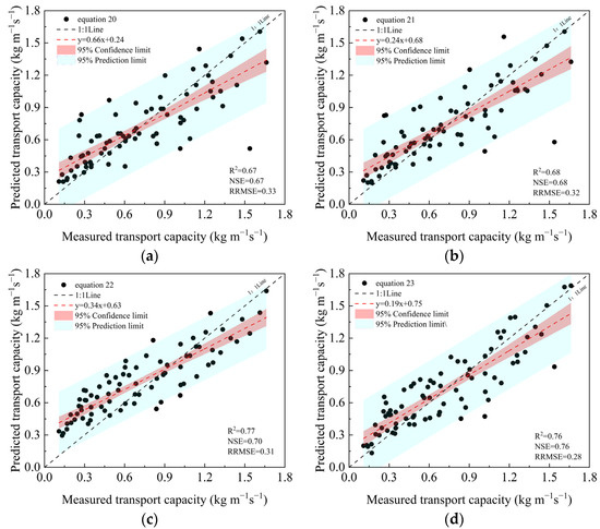 According to the path analysis results, a series of Tc equations were established for gravel-covered slope conditions (Table 4). The R² values of these equations ranged from 0.67 to 0.77, with NSE values ranging from 0.67 to 0.76 and RRMSE from 0.28 to 0.33, indicating relatively low predictive accuracy (Table 4). The data points representing the predicted and measured values deviate significantly from the 1:1 line (Figure 8), indicating a high degree of prediction error. Consequently, none among Equations (3)–(6) effectively modeled the Tc values of gravel-covered slopes.