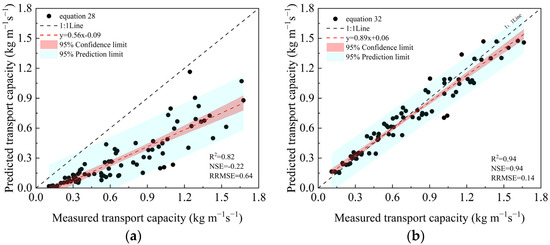 The regression analysis indicates that Equation (32) can effectively simulate the Tc values, with an R2 of 0.94 and an NSE of 0.94. As shown in Figure 10b, the deviation between the measured and computed values is minimal, and the data points are all distributed near the 1:1 line, indicating that the reorganized Box equation can successfully predict the Tc of gravel-covered slope flow.