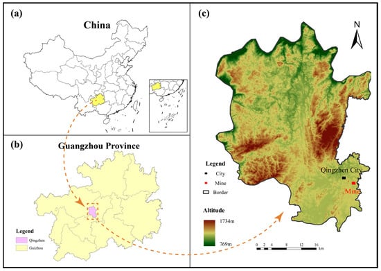 Geographical location of the study monitoring well in Qingzhen City, Guizhou Province. (a) Displays the location of Guizhou Province within China; (b) provides a zoomed-in view of Guizhou Province, with a focus on Qingzhen, shown in the highlighted area; (c) presents a detailed topographic map of the study area, with the elevation ranging from 769 m to 1734 m, indicating the locations of Qingzhen City and the mine.
