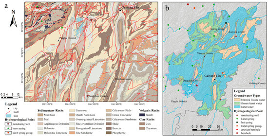 Lithological and hydrogeological distribution maps of the study area. (a) Lithological map showing the distribution of sedimentary, volcanic, and clay rocks, along with faults marked in red lines; (b) hydrogeological map illustrating groundwater types, including karst water, fissure–karst water, and bedrock fissure water, as well as key hydrogeological points, such as monitoring wells and springs.