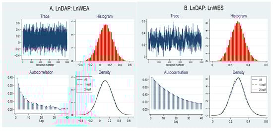 Roy [51] suggests that Markov chains must support convergence to ensure robust Bayes analysis. To ensure that Bayesian inference based on the MCMC sample simulation is a reasonable method with the Gibbs sampler to estimate the posterior distribution, I use the convergence diagnostic of MCMC chains for the DAP model. When MCMC chains converge, Bayesian inference is robust. The testing of the convergence of MCMC chains is performed through trace plots, histograms, autocorrelation, and Gelman–Rubin convergence estimation.