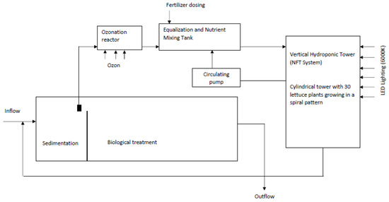 Hydroponics, a rapidly advancing method of cultivation, allows for the growth of vegetables in a soilless culture utilizing artificial lighting, which has been found to have a limited impact on the environment. In hydroponic systems, plants are grown in a medium that supports the root structure, as opposed to soil. This medium is commonly placed in nets on a waterbed and the plants are supplied with nutrients through a nutrient solution [2]. Hydroponic technology presents several benefits, particularly in terms of sustainability. In the context of this study, hydroponic cultivation utilizes low-potential waste heat energy, such as that derived from industrial processes or renewable sources [3,4], providing a system for growing vegetables year-round. The controlled environment eliminates the need to contend with extreme weather conditions, reduces the energy required for tillage, and eliminates the need for pesticides to combat animal pests and weeds. Additionally, the use of domestic wastewater in hydroponic production can be an effective solution in an era of increasing water stress [5]. The reuse of nonrecycled, nutrient-rich hydroponic waste solution and PDW for growing plants in greenhouses is a possible way to control environmental pollution [6]. The benefit of reducing pollutants in wastewater is also important, as well as the utilization of nutrients by plants and therefore reducing burden on the environment. Approximately 25% of water impairments are attributed to nutrient-related issues such as oxygen depletion, algal growth, biological integrity, and turbidity [7]. To enhance the quality of wastewater and reduce the detrimental impact on freshwater resources, it is essential to remove organic pollutants from wastewater [8].