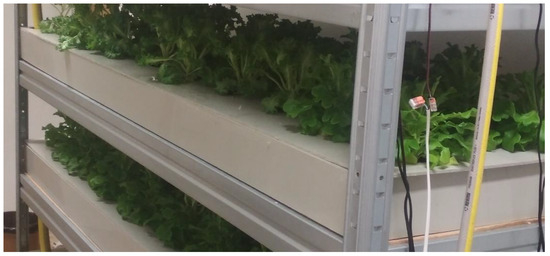 Salads were seeded in rock wool blocks, suitable for water temperatures up to 25 °C and a pH of 5.8 to 6. For the source of growth light, LED strips (cold white light) with a correlated color temperature of 6000 K, a luminous flux of 2100 lm/m, 120 LED per meter, a power rating of 20 W/m, and a light degree of 120° were used. The growth area on one floor was 195 × 56 cm, and each floor had four strips of lights, 10 cm apart, with a distance from the growing base 20.5 cm. This resulted in an even spread of the luminous flux across the growing space. The diagram of the research system is shown in Figure 1 and Figure 2.