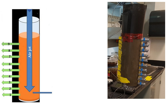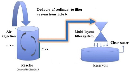 The setup for resuspension of the sediment (Figure 2) consisted of the aeration section with an air jet linked to the laboratory’s central compressed air system and a vertical cylinder of 20 cm in internal diameter and 50 cm in height. The cylinder sidewall features multiple outlet holes positioned at varying heights: hole 1 (1.5 cm), hole 2 (6.5 cm), hole 3 (11.5 cm), hole 4 (16 cm), hole 5 (21 cm), hole 6 (26 cm), hole 7 (31 cm), hole 8 (35.5 cm), hole 9 (40.5 cm) (Figure 3). Sediment samples were homogenized and subsequently combined with tap water at a ratio of 1:10 (v/v) in the reactor, reaching a height of 40 cm. Tap water was utilized in all experiments as the river was the source of tap water. The plastic cover avoided the loss of water and sediments during aeration. After 2 h, aeration was stopped to allow the settling of the coarser sediments. After 15 min, the coarse silt and sand particle fractions almost completely settled. From hole 6, the slurry in the reactor that included water, suspended particulate matter (SPM), and organic matter was extracted and directed to the filter system.