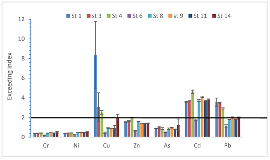 Exceeding index (EI) for metals in sediment samples for various stations (2019) (The line indicates the EI at 2).