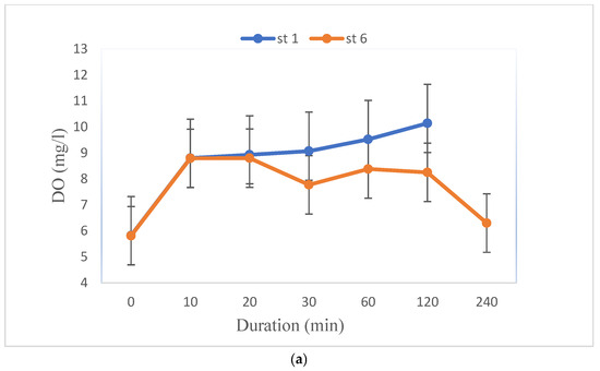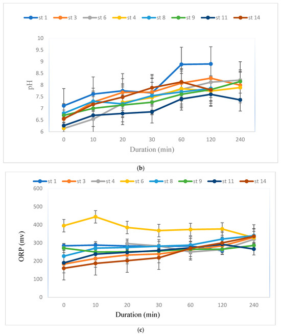 Laboratory analyses were carried out to assess the pH, dissolved oxygen (DO), and oxidation–reduction potential (ORP) values. The DO and ORP showed that the surface sediments were oxic prior to the test. Figure 6 illustrates the changes in DO, ORP, and pH throughout the resuspension tests. While resuspending the surface sediment from 2019, the DO concentration of the slurry rose quickly in the initial 10 min and continued to increase as the resuspension period concluded. Nonetheless, the DO gradually diminished and returned to the original level after 2 h. ORP rose significantly during the resuspension. The improvement of ORP and DO was due to the air injection during the resuspension [40].