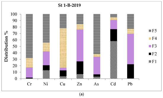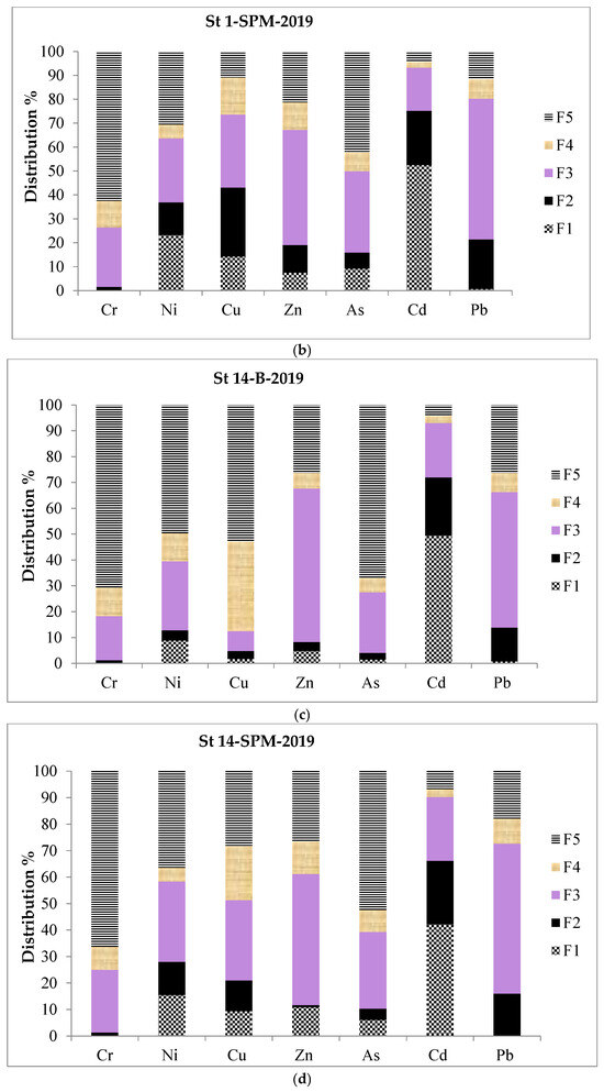 Sequential extraction test (SET) analyses for stations 1 and 14 (2019). The fractions are (F1) exchangeable, (F2) bound to carbonates, (F3) bound to Fe–Mn oxides, (F4) bound to organic matter, and (F5) residual; (a) before remediation in station 1, (b) SPM in station 1, (c) before remediation in station 14, (d) SPM in station 14.