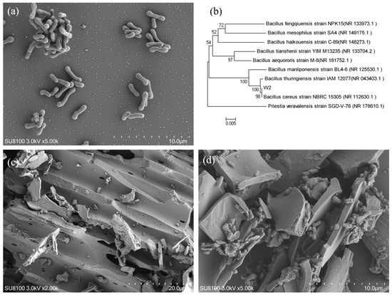 SEM image (×5000 times) (a) and phylogenetic tree (b) of strain W2, SEM image of BC (×2000 times), (c) and IW2 (×5000 times) (d).