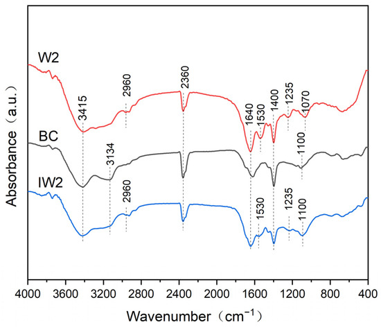 The FTIR spectra of strain W2, biochar (BC), and biochar-immobilized W2 (IW2) are shown in Figure 2. The absorption peaks at 3427 cm−1 of W2, BC, and IW2 were a characteristic peak generated by the stretching vibration of -OH [34]. The peaks at 2960 cm−1 of W2 and IW2 were attributed to the stretching vibrations of –CH [35]. The absorption peaks at 2360 cm−1 were the characteristic peak of C = C in aromatic rings in W2, BC, and IW2. The absorption peaks at 1640 cm−1 and 1400 cm−1 were mainly generated by the stretching vibrations of C=O [36] in W2, BC, and IW2. The peaks around 1530 cm−1 were assigned to the bending vibration of –CN/-NH bond [37] in W2 and IW2. The peaks at 1000–1250 cm−1 were attributed to the stretching vibration of C–O in W2, BC, and IW2 [38]. Previous research has shown that functional groups such as COOH, -OH, and -C=C-OH in biochar have good affinity for microbial cell membranes [39], which is beneficial for the adhesion and proliferation of microbial cells. The IW2 contained the functional groups of W2 and BC, which means that the bacteria were successfully immobilized on the biochar.
