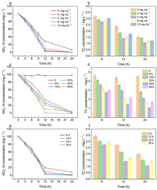 Effect of preparation condition on the degradation properties: effect of biochar dosage on the degradation of NO3−-N (a) and TC (b); effect of bacterial dosage on the degradation of NO3−-N (c) and TC (d); effect of immobilization time on the degradation of NO3−-N (e) and TC (f).