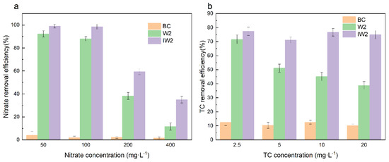 Figure 4 shows the NO3−-N and TC removal efficiency under different initial NO3−-N and TC concentrations. As shown in Figure 4a, the adsorption of NO3−-N by the biochar only accounts for less than 10% under different initial concentrations. The NO3−-N removal efficiency decreased from 92.30% to 11.58% for free bacteria (W2) and from 99.07% to 34.97% for biochar-immobilized bacteria (IW2) with the NO3−-N concentration increased from 50 to 400 mg·L−1 after 24 h. Zhang et al. [32] pointed out that the longer lag phases of bacteria and toxic effect caused by high nitrate concentration resulted in the reduced nitrate removal rate. The nitrate removal efficiency was enhanced by the immobilized bacterial cells, especially in the high concentrations. As shown in Figure 4b, the TC removal efficiency decreased from 71.60% to 38.78% for free bacteria (W2) with the TC concentration increased from 2.5 to 20 mg·L−1 after 12 h of incubation. The initial TC concentration showed little effect on the TC removal efficiency of biochar-immobilized bacteria (IW2) within the tested concentration ranges. The immobilized bacteria showed significantly higher TC removal efficiencies than free ones, which was related to the adsorption and protection of bacteria by BC [43]. Previous studies also reported the simultaneous removal of NO3−-N and TC by immobilized microorganisms (Table 1). It can be seen that loofah-based systems demonstrate comparatively lower removal efficiencies (91.97% for NO3−-N and 57.39% for TC) [44], and polyurethane foam (PUF) achieves a comparable performance to the current study (99.18% NO3−-N and 77.30% TC removal) [45]. However, PUF’s potential environmental risks necessitate alternative solutions. The developed biochar-based system addresses these limitations by combining enhanced removal efficiency (99.50% for NO3−-N and 78.60% for TC) with environmental sustainability, offering a technically superior and ecologically sound approach for simultaneous NO3−-N and TC removal.