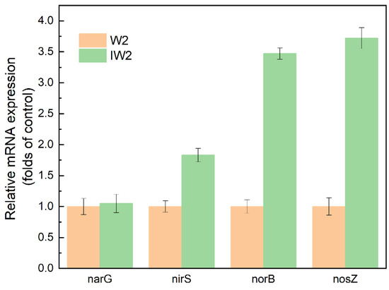 The expression level of denitrification function genes was shown in Figure 5. As shown in the figure, the expression levels of narG showed no significant differences between W2 and IW2. The expression levels of nirS, norB, and nosZ of the immobilized W2 cells were up-regulated by 1.83 times, 3.47 times, and 3.72 times of the free ones, respectively. The up-regulated denitrification functional genes led to an improved denitrification performance. It was reported that the up-regulation of gene expression by biochar may be attributed to the following reasons: (1) biochar’s adsorption capacity enhances nitrate accumulation near immobilized bacterial cells, facilitating substrate transport and inducing denitrification gene upregulation [32]. (2) The release of soluble organic compounds and essential nutrients from biochar potentially contains bioactive components that promote the denitrification gene expression [43].