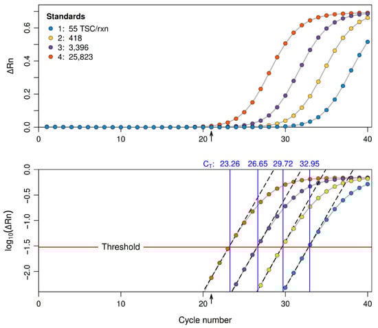 Amplification curves for a series of four E. coli target sequence standards with known numbers of target sequence copies per reaction (TSC/rxn). Points are averages of three replicates per standard. Standard concentrations increase from right to left and are plotted with different colors. (Top) Background-corrected normalized reporter fluorescence  (a measure of fluorescence reported by the analytical instrument, Section 2.3.1) versus PCR cycle number. (Bottom) Log10 background-corrected normalized reporter fluorescence  versus cycle number. Dashed black lines are linear regression models fitted to the linear portion of each  curve. The red horizontal line passing through the linear portions of these curves is the fluorescence threshold; the fractional cycle numbers at which the  curves intersect this threshold are indicated by vertical blue lines and are the corresponding threshold cycles  (blue numbers at the top of the panel), which are discussed in Section 2.3.2. The arrow on the horizontal axis in the top panel indicates the lowest cycle number for which data are included in the bottom panel. Data: Molly J. Lane, Robert B. Annis Water Resources Institute; data for standard 4 were used to create Figure 1.