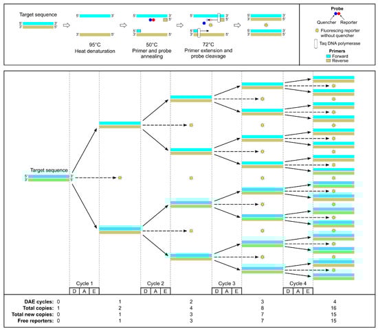 The main steps in target sequence amplification and the corresponding production of fluorescing free reporters with qPCR. (Top) Schematic diagram of the main steps within a single amplification cycle of a target DNA sequence, which comprise denaturation of DNA at 95 °C, annealing of forward and reverse primers and probe at 50 °C, and primer extension and probe cleavage at 72 °C. (Middle) Schematic diagram of four amplification cycles of a target sequence, including production of fluorescing free reporters. D: denaturation; A: annealing; E: extension. (Bottom) Summary of the cumulative numbers of DAE cycles, target sequence copies, and fluorescing free reporters produced in the four amplification cycles shown in the middle panel for the ideal case where amplification efficiency is 100%.