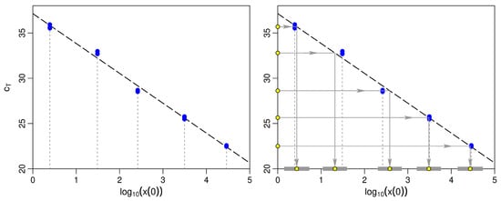 Example of the relationship between measured  values (blue dots) and  in standards for a qPCR calibration run employing five standards with three replicates each. The dashed line is the fitted standard curve (linear regression model). Dotted vertical lines indicate  values in standards. Left: Data and standard curve only. Standard concentrations are 2.5, 30.8, 261.3, 3125.3, and 29,066.7 gene copies per reaction. Right: Data and standard curve supplemented with five new  values (yellow-filled dots on the vertical axis) and corresponding predicted  values (yellow-filled dots on the horizontal axis) calculated with Equation (22). Arrows indicate direction of prediction. Also shown are estimated 95% confidence intervals (gray bars on the horizontal axis) for the predicted  values. Numerical values of estimates are shown in Table 2. Data: John J. Hart, Robert B. Annis Water Resources Institute.