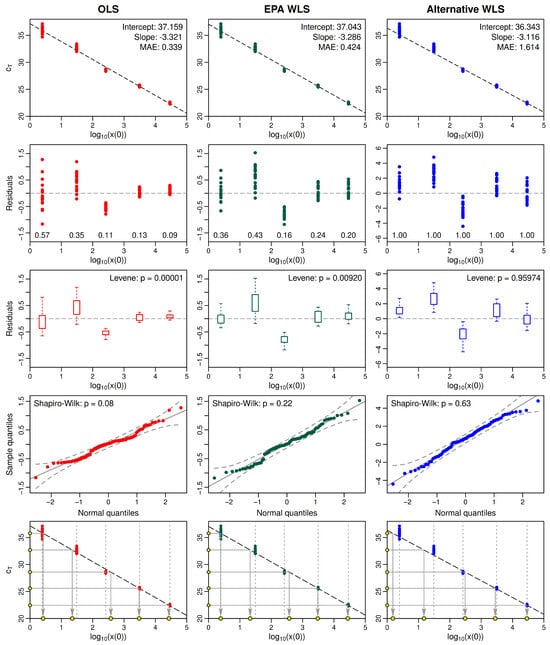 To address the other source of error in estimates of the number of TSC per reaction in field samples, we may supplement these estimates with 95% confidence intervals. If the assessment of the fitted standard curve and residuals indicates that the assumptions of ordinary least-squares regression are tenable (in particular, normality and homoskedasticity of residuals; see Section 2.4), then a 95% confidence interval for  can be estimated using the classical statistical theory of linear calibration (e.g., []). The residuals in Figure 4 (left) show no obvious violation of the regression assumptions, so we used these data to calculate examples of 95% confidence intervals for several predicted -transformed initial concentrations calculated from the inverted fitted standard curve. The new  values used to predict the -transformed initial concentrations were (arbitrarily) chosen as the means of the observed  values for the five different standards plotted in Figure 4(left). The resulting predicted values and 95% lower and upper confidence limits are displayed in Table 2 and plotted in Figure 4(right). Note that the actual standard concentrations (vertical dotted lines) fall within the corresponding 95% confidence intervals for the predicted concentrations (gray bars on the horizontal axis). In cases where the regression residuals are approximately normal but clearly heteroskedastic, as is often the case in environmental applications, the classical calibration confidence interval will be only a rough approximation.