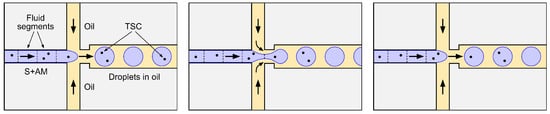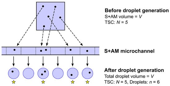 Pressurized air pushes the S+AM and oil through separate microchannels which, as they merge, partition the S+AM into approximately 20,000 nanoliter-size droplets with a final volume (droplets in oil) of approximately 40 μL. This mixture of S+AM and oil is pipetted into a new plate. After all wells are filled in this way, the new plate is sealed with foil and placed on a thermocycler for amplification. When amplification is complete, the plate is placed on a droplet reader where a needle pierces each well, aspirates the contents, and passes the droplets through the droplet reader, where the fluorescence amplitude of droplets is measured, one droplet at a time. The analyst sets a fluorescence intensity threshold, which software for the droplet reader uses to classify droplets as positive (fluorescence intensity greater than the threshold) or negative (fluorescence intensity less than the threshold). The software then uses the number of negative droplets, the total number of droplets, and an assumed mean droplet volume to calculate the TSC concentration in the S+AM (Section 3.2.1).