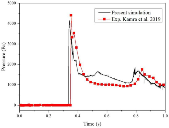Comparison of pressure (Pa) evolution along with time (s) between experiment [48] and simulation.