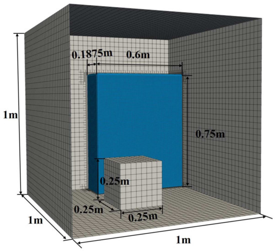 In order to further verify the new VOF–DPM solver, the simulation results of the solver are compared with those of the solver using the standard VOF method. To ensure that the results of the two solvers are not affected by other factors, the settings of the two solvers are kept consistent. In this simulation, the computational domain is set as a cube with dimensions of 1 m in length, width, and height. An obstacle measuring 0.25 m in length, width, and height is set at the center of the bottom. The initial region for the water phase is set to 0.6 m × 0.1875 m × 0.75 m, located in the inner corner and near the wall. The domain is discretized into 32 × 32 × 32 cells, resulting in a total of 32,256 grids. Additionally, the maximum refinement is set to 2, with refinement occurring in regions where the phase volume fraction ranges between 0.01 and 0.99. The computational domain and mesh configuration are shown in Figure 3.