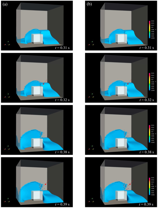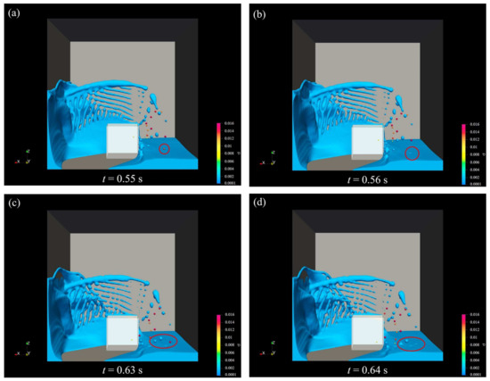 Figure 1 shows the comparison between experimental observations and simulations results. The free-surface features at t = 0.3 s, 0.6 s, and 0.85 s are shown. The dimensions of the computational domain are 0.8 m × 0.2 m × 0.6 m, and the mesh configuration is set to 56 × 14 × 42, resulting in a total of 32,928 grids. Figure 1b–d shows the interface features in simulations using different refinement levels corresponding to 0, 1, and 2. In all cases, the main morphologies of the interface are similar, but a discrepancy exists between the experimental and simulation results when the refinement level is below 1 due to the loss of droplets. With a refinement level of 2, as shown in Figure 1d, the simulation reproduces the interface features well compared with the experimental observations. Therefore, it is thought that this mesh resolution is suitable to capture the free-surface features.
