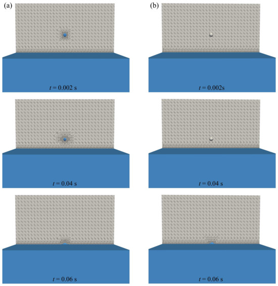 The falling process of the droplet is shown in Figure 7, where Figure 7a shows the VOF simulation result and Figure 7b shows the VOF–DPM simulation result. It is observed that the AMR method refines the mesh around the droplet by tracking the interface. Using the VOF–DPM solver, the droplet is converted into a Lagrangian point after the initial setting, and it is represented by a sphere with the actual diameter. The background mesh remains unrefined, meaning that the new solver can reduce computational costs and enhance efficiency. When it touches the free surface at t = 0.06 s, the droplet is converted into the VOF field, and the interface is further tracked by the VOF–AMR approach.