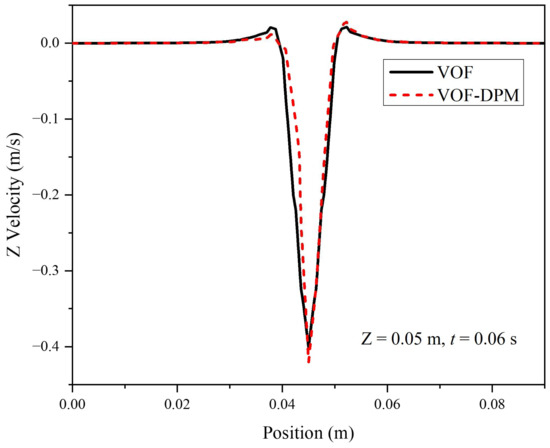 To verify the momentum coupling between the Eulerian and Lagrangian fields, the velocity in the Z direction, simulated by both the VOF method and the VOF–DPM method, is compared. Figure 8 shows the vertical velocity distribution along with the line at Z = 0.05 m, Y = 0.045 m at t = 0.06 s, when the droplet just touches the free surface. The results from both methods confirm well with each other, indicating the accuracy of the Eulerian–Lagrangian momentum coupling in the VOF–DPM method.
