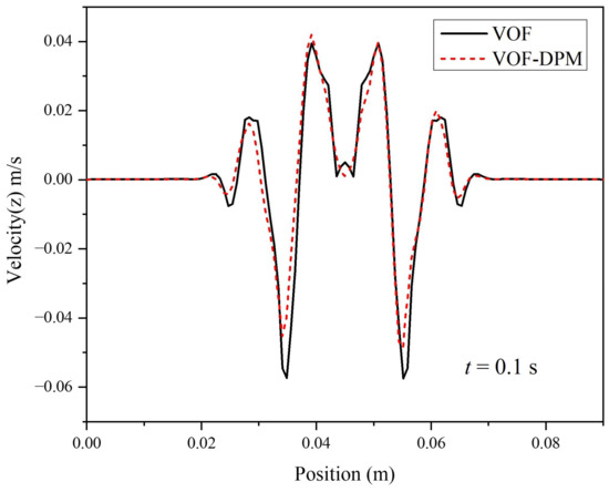 Quantitatively, the velocity distributions on the free surface obtained by both the VOF and VOF–DPM methods are compared. Figure 10 shows the curves of vertical velocity evolution along the intersection line between the y = 0.045 m plane and the free surface at t = 0.1 s. The horizontal axis represents the X-axis coordinate in the simulation. The results demonstrate that the VOF simulation closely matches the VOF–DPM simulation.
