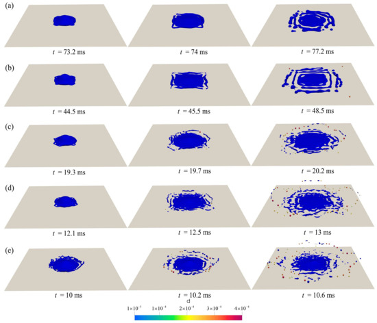 The morphological comparison at different injecting speeds can be seen in Figure 11, where different rows represent different initial velocities, and the columns represent different stages of splashing. The first column reveals that shortly after the droplet impacts the bottom, it spreads out. At this stage, there is no significant difference among Figure 11a–d, although small droplets are already visible in Figure 11e. As time progresses, the droplet begins to splash in all directions. The second column shows the splashing pattern when the center of the droplet just flattens. By comparing the figures at different injecting speeds, it is evident that higher velocities make splashing more likely to occur. Figure 11a–e shows that more small droplets are generated around the splashing area at higher speeds, and the interface becomes more dispersed. The last column presents the splashing images at a later stage before reaching a stable state. The results show that at low velocities, almost no small droplets are generated, as seen in Figure 11a,b. As the speed increases, Figure 11c displays droplets forming and splashing around. Further increasing the speed leads to more small droplets and higher splashing, as shown in Figure 11d. However, when the speed increases further, the number of small droplets does not change significantly, but the diameter of the droplets becomes larger as less liquid remains on the wall, as shown in Figure 11e.