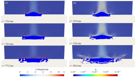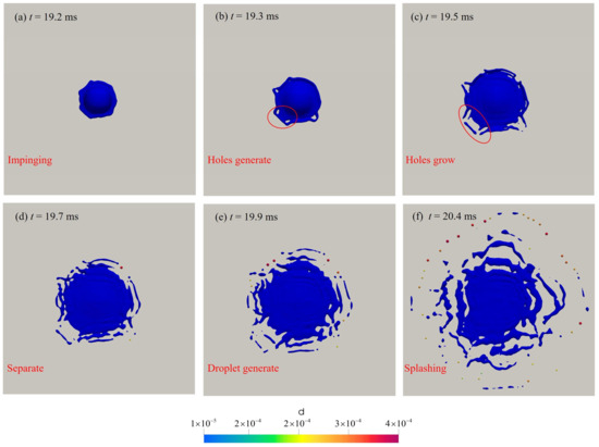 To understand the development process of splashing following droplet collision, the present work examines the entire sequence of a droplet impacting the wall at an injecting speed of 5 m/s, as illustrated in Figure 13. Figure 13a shows the droplet just after it has collided with the bottom. At this moment, the liquid spreads out in all directions, and the free surface remains continuous. In Figure 13b, several holes are generated in the liquid film, as indicated by the red circle. Next, the holes become bigger, causing some of the liquid to become separated, and during this process, many new holes are formed, allowing more liquid to be separated. In Figure 13e,f, the separated strip-like droplets further form smaller spherical droplets under the action of surface tension. During the splashing process, it is found that the spherical droplets are transformed into Lagrangian droplets, which are well resolved by the VOF–DPM method.
