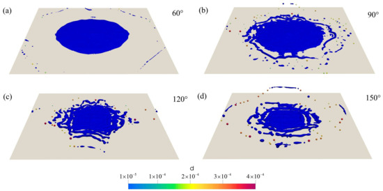 Figure 14 shows the splashing morphology of droplets with an injecting speed of 5 m/s impacting the wall surface at different contact angles at t = 20.6 ms. By comparing these four figures, it is evident that a hydrophilic wall promotes droplet spreading upon impact, whereas a hydrophobic wall tends to splash. Furthermore, it is observed that the larger the contact angle is, the higher the splashing height. Additionally, the diameter of the discrete droplets in Figure 14d appears notably larger than those in Figure 14b,c. To quantify the relationship between the contact angle and the diameter of the discrete droplets produced by splashing, two metrics, and , are introduced to evaluate the average diameter of discrete droplets generated at different contact angles. These can be calculated using the following formula: