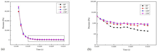 To analyze the impact of droplets on the wall at different contact angles, the pressure changes over time on the wall are shown in Figure 16. Considering that the instantaneous impact force of the droplet on the wall is significant, with pressure distribution concentrated when the droplet first touches the wall and then dispersed in the subsequent process, the present work adopted the maximum pressure to evaluate the force exerted by the droplet on the wall. Figure 16a illustrates the relative pressure on the wall, showing that upon the impact of droplets, the wall experiences larger pressure, which then decreases with time. A larger contact angle results in higher wall pressure. After a period of time, because the condition with a smaller contact angle has a wider diffusion range than that with a larger contact angle, the pressure on the wall becomes smaller. As shown in Figure 16b, when the wall is hydrophilic, the relative pressure on the wall is significantly smaller than that on a hydrophobic wall. With increasing contact angle, the pressure difference diminishes. When the contact angle exceeds 120°, the pressure on the wall remains almost unchanged.