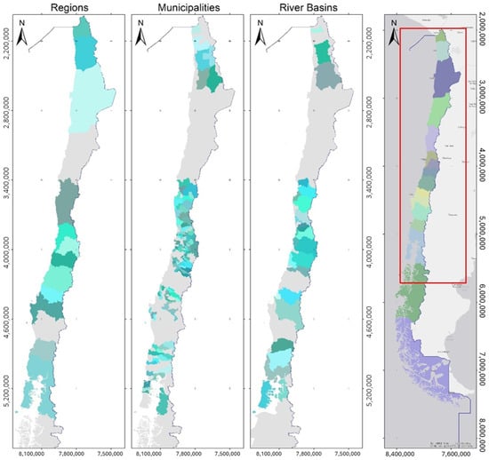 This study encompasses data from 12 out of Chile’s 15 regions at the time (nowadays Chile comprises 16 regions), including 150 municipalities and 26 river basins, with a total basin area of 233,936.69 km2 (see Figure 1 and Table 1 for details on the study area).