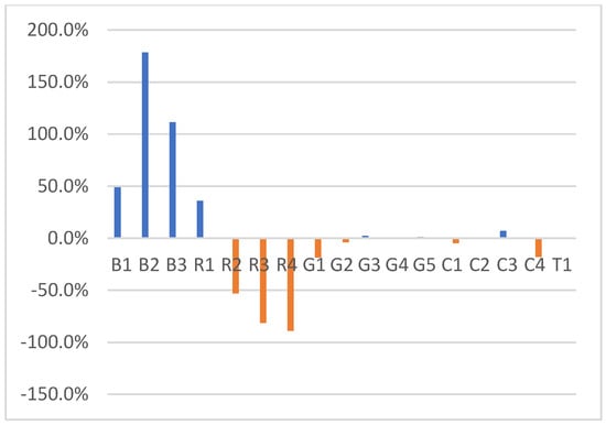 Relative Change in Unitary Price. This figure displays the percentage change in unitary price across different subgroups categorized under Transactional, Product, Contextual, and Temporal variables. For Transactional variables, the indicators B1, B2, and B3 represent buyers from the real estate, mining, and agricultural sectors, respectively. Under Resource variables, R1 representing subterranean water source and R2 to R4 denote the quartiles 2 to 4 of the amount of water involved in the transaction. Contextual variables are divided into two categories: Geopolitical, demographic, and economic factors are represented by G1 to G5, where G1 is the rurality index, G2 is the Accumulated Scarcity Decree, G3 indicates a mining municipality, G4 is the municipal income per capita, and G5 is the regional GDP per capita. Climatic variables, labeled C1 to C4, refer to annual precipitation, maximum temperature, precipitation variation, and maximum temperature variation, respectively. The temporal variable, T1, indicates the year.