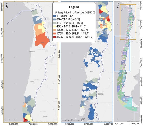 This spatial price distribution may be attributed to varying levels of industrialization and intensive agricultural practices prevalent in the central regions, contrasted with the mining-dominated economy of the northern regions [61]. The Metropolitan Region, as a hub of industrial and economic activity, alongside the agriculturally rich areas of the Valparaíso Region, aligns with the observed price concentration. In contrast, the southern region of Chile demonstrates a markedly lower and more stable price range, fluctuating between 1 and 400 UF/L/s (MUSD 0 to 16). This valuation consistency is reflective of the abundant water supply, attributed to the voluminous flow rates of southern rivers and the less uncertainty about water provision.