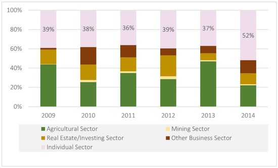 Accompanying this analysis, a time-series graph delineates the relative sectorial participation from 2009 onwards, encapsulating 98% of the data points (see Figure 6). This temporal focus is due to the statistical robustness of the period, with preceding years presenting unstable and less reliable distributions. The graphical analysis reveals that individual participation—representing natural persons—fluctuates between 37 and 52%, without a discernible trend towards either an increase or a decrease. However, it is crucial to note that this analysis pertains to annual demand and may not directly reflect the distribution of WRs ownership.