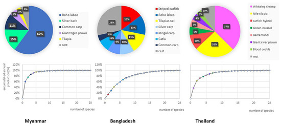Diversity of the aquaculture sector in Myanmar compared to neighboring Bangladesh and Thailand. Characteristic curve of the accumulated annual production ranked by intensity reveals a substantially less diverse sector in Myanmar.