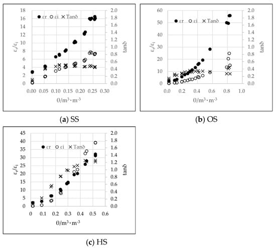 Laboratory tested relative complex permittivity (εr, εi) and loss tangent (tanδ) under different soil water content conditions of three soils, (a) SS, (b) OS, (c) HS.