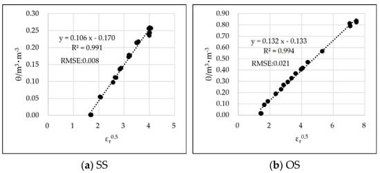 The slope values for SS, OS, and HS were 0.106, 0.132, and 0.113, respectively. These values are primarily controlled by the relative permittivity of soil water (), which is consistent across all soils. The slight variations in slope can be attributed to the random errors in data fitting.