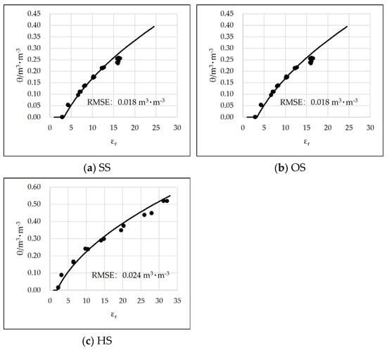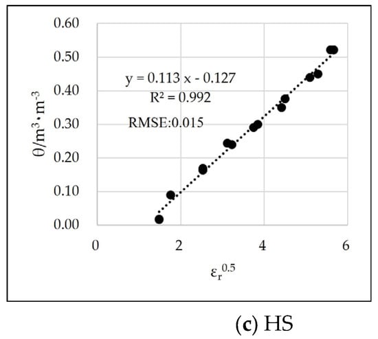 The intercept values for SS, OS, and HS were −0.170, −0.133, and −0.127, respectively. These values are influenced by soil porosity () and the relative permittivity of the soil matrix (). SS, with the highest bulk density (1.523 g/cm3) and lowest porosity (0.430), exhibited the lowest intercept, reflecting its compact structure and limited pore space. In contrast, OS and HS, with higher porosities (0.870 and 0.720, respectively), had higher intercepts. However, the relationship between intercept and porosity for OS and HS appears counterintuitive, as OS, with the highest porosity (0.870), had a slightly lower intercept (−0.133) compared to HS (−0.127). This discrepancy may be attributed to random errors in the soil testing process or the influence of other factors, such as organic matter content and soil texture, which can affect the dielectric properties of the soil. Additionally, the linear fitting process optimizes the slope and intercept to minimize RMSE, which may result in slight deviations from the expected trend.