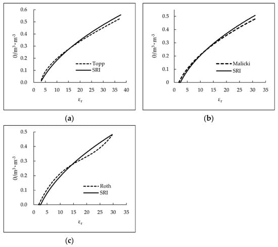 Comparison between SRI model and equations published by (a)Topp, (b) Malicki and (c) Roth for mineral soils.