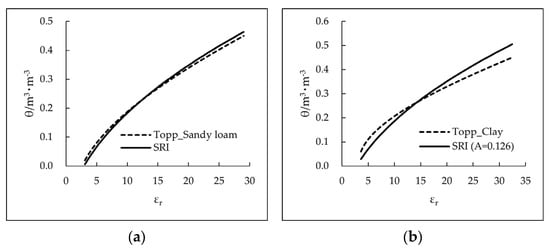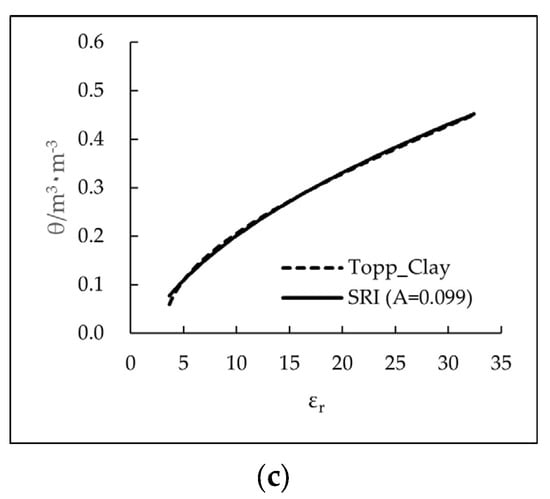 For clayey soils, the actual value of A in the SRI model is challenging to determine theoretically due to the variation in with water content in dielectric loss soils. However, based on the general form of the SRI model (Equation (10)), the relationship between and remains linear: , where both A and B are unknown variables. By linear fitting, we obtained A = 0.099 and B = −0.112 for Topp’s heavy clay soil. Figure 5c shows that the SRI model with these modified parameters perfectly matches the Topp equation for heavy clay soil with an RMSE of 0.005.