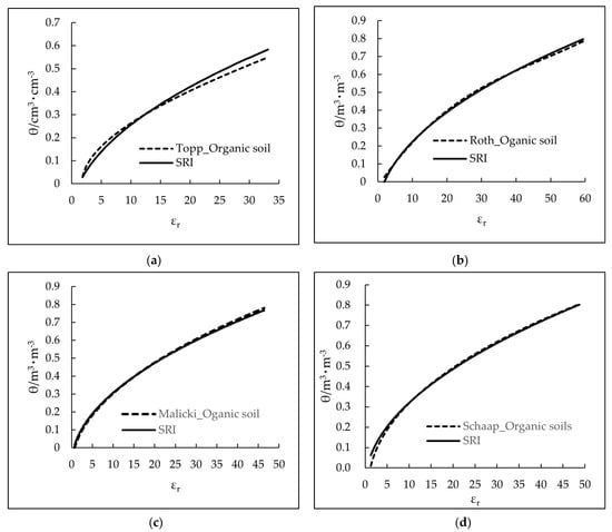 Comparison between SRI model and (a) Topp equation, (b) Roth equation, (c) Malicki equation and (d) Schaap equation for organic soil.