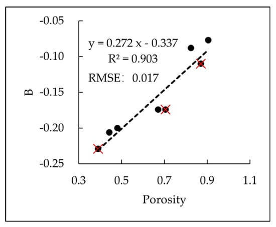 Statistical relationship between soil porosity and parameter B in SRI model for different soil (red cross marks represents our tested three soils, SS, OS and HS).