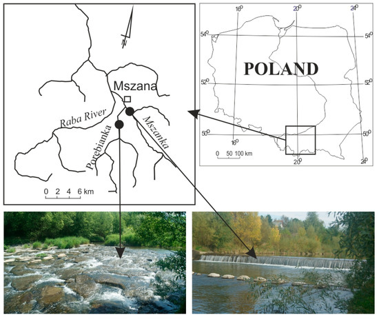 The study was carried out in the Porębianka and Mszanka rivers in southern Poland, Carpathian tributaries of the Raba River, which is a right-bank tributary of the Vistula River (Figure 1, Table 1). The upper slopes of the river catchments are mostly forested and representative of the relief of middle mountains comprising flysch, with elevations reaching 1300 m a.s.l. Presently, the lower parts of the catchments, 700–400 m a.s.l., are densely inhabited and utilised as meadows and cultivated land. The average annual precipitation is 1000 mm, peaking in the summer months [29].